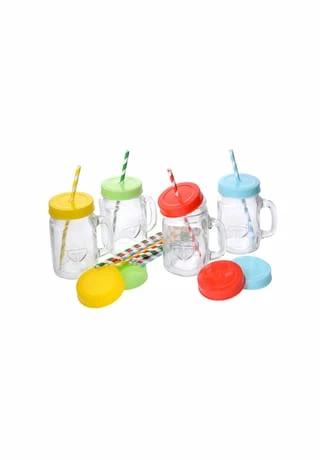 Henkelglas mit Schraubverschluss, Trinkhalm und Deckel im 4er Set. Für Smoothies, Milkshakes, selbstgemachte Limonaden oder als Vorratsglas. Dank Schraubdeckel lassen sich Getränke problemlos transportieren. Lieferumfang: – 4 Trinkgläser mit Henkel Höhe ca. 13 cm, Ø ca. 6 cm, Gewicht ca. 336 g, Füllmenge ca. 450 ml – 4 Schraubverschlüsse, geschlossen Ø ca. 7 cm, Gewicht ca. 10 g, Farben blau, grün, rot und gelb – 4 Schraubverschlüsse mit Strohhalmloch Ø ca. 7 cm, Gewicht ca. 10 g, Farben blau, grün, rot und gelb – 20 Strohhalme Länge ca. 19,5 cm, Ø ca. 0,5 mm, Gewicht ca. 2 g, Farben (5x blau, 5x grün, 5x rot und 5x gelb)