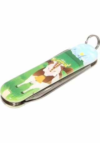 Ausgestattet mit Klinge, Nagelfeile mit Schraubendreher, Schere und Ring sowie Zahnstocher und Pinzette