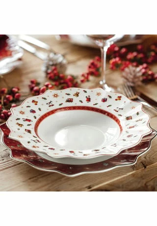 Mit der weihnachtlichen Kollektion Toy’s Delight von Villeroy & Boch bringen Sie besinnliche Festtagsstimmung in Ihr Zuhause. Die vielseitige Artikelauswahl lädt ein zum kreativen Kombinieren, Sammeln und Verschenken. Detailverliebte Motive und Muster in den weihnachtlichen Farben Rot, Grün und Weiß versprühen nostalgischen Charme und wecken Kindheitserinnerungen. Die Kollektion ist der perfekte Begleiter für die besinnliche Winterzeit. Der Name Villeroy & Boch steht bereits seit 1748 für edles Porzellan höchster Qualität. Dieser zauberhafte weiße Teller eignet sich für eine leckere Brühe als Vorspeise oder für Suppen und Eintöpfe als Hauptgericht. Bringen Sie Weihnachten auf den Tisch mit Porzellan von Villeroy & Boch. Mikrowellensicher und am besten von Hand reinigen. Für Suppen, Eintöpfe und Bouillons Gefertigt aus hochwertigem Premium Porcelain Passt zu Toy’s Delight Royal Classic und zu Toy’s Fantasy